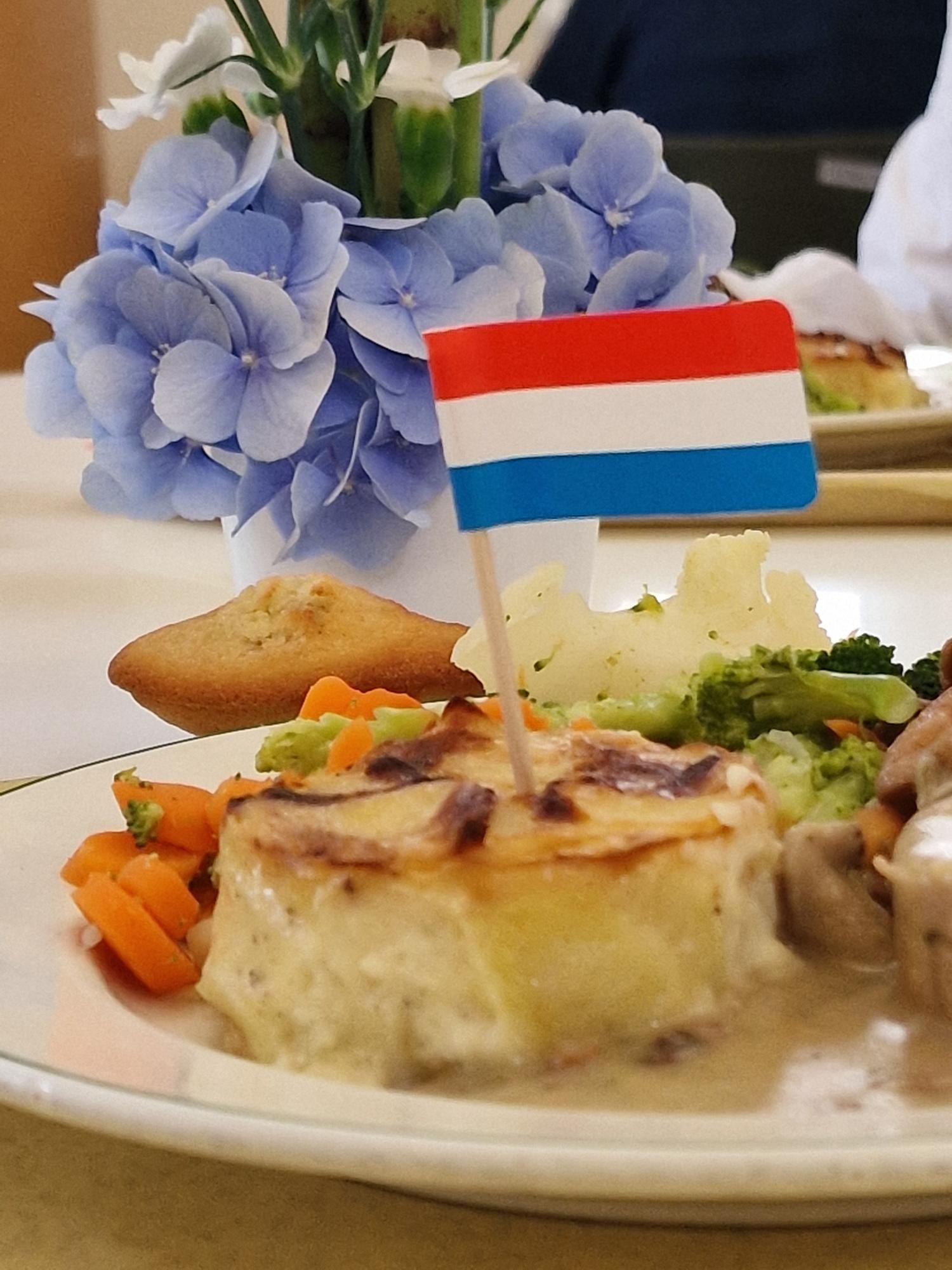 Inspiréiert vum groussherzogleche Galadinner am Palais goufen, am festlech dekoréierte Sall, nieft Saumon-Carpaccio, eng Kallefsbrëschtche mat Champignonszooss zerwéiert an als Dessert e Mango-Bavarois-Royal proposéiert.
